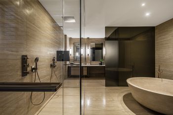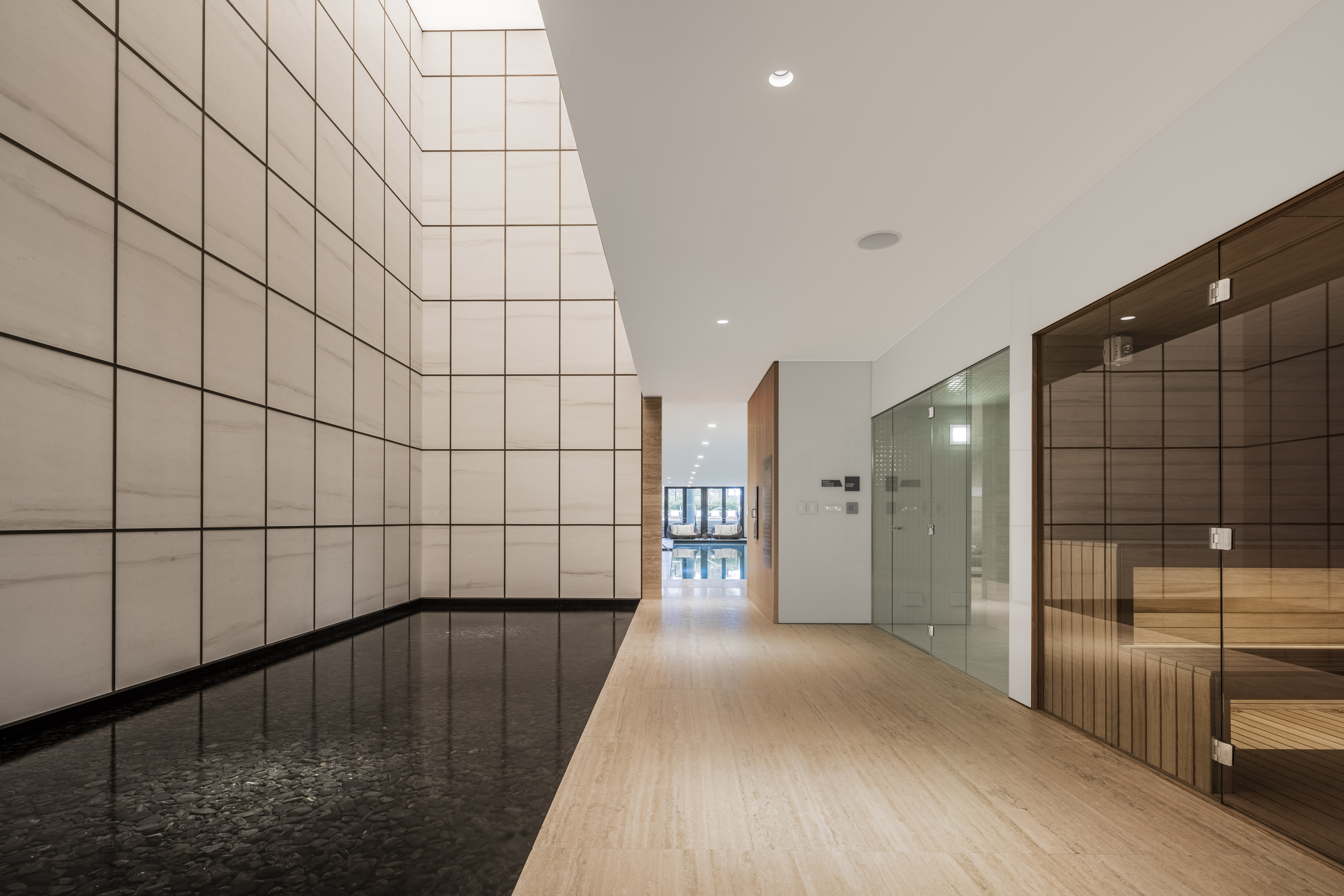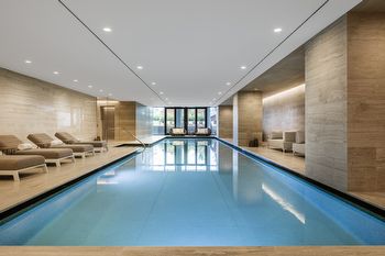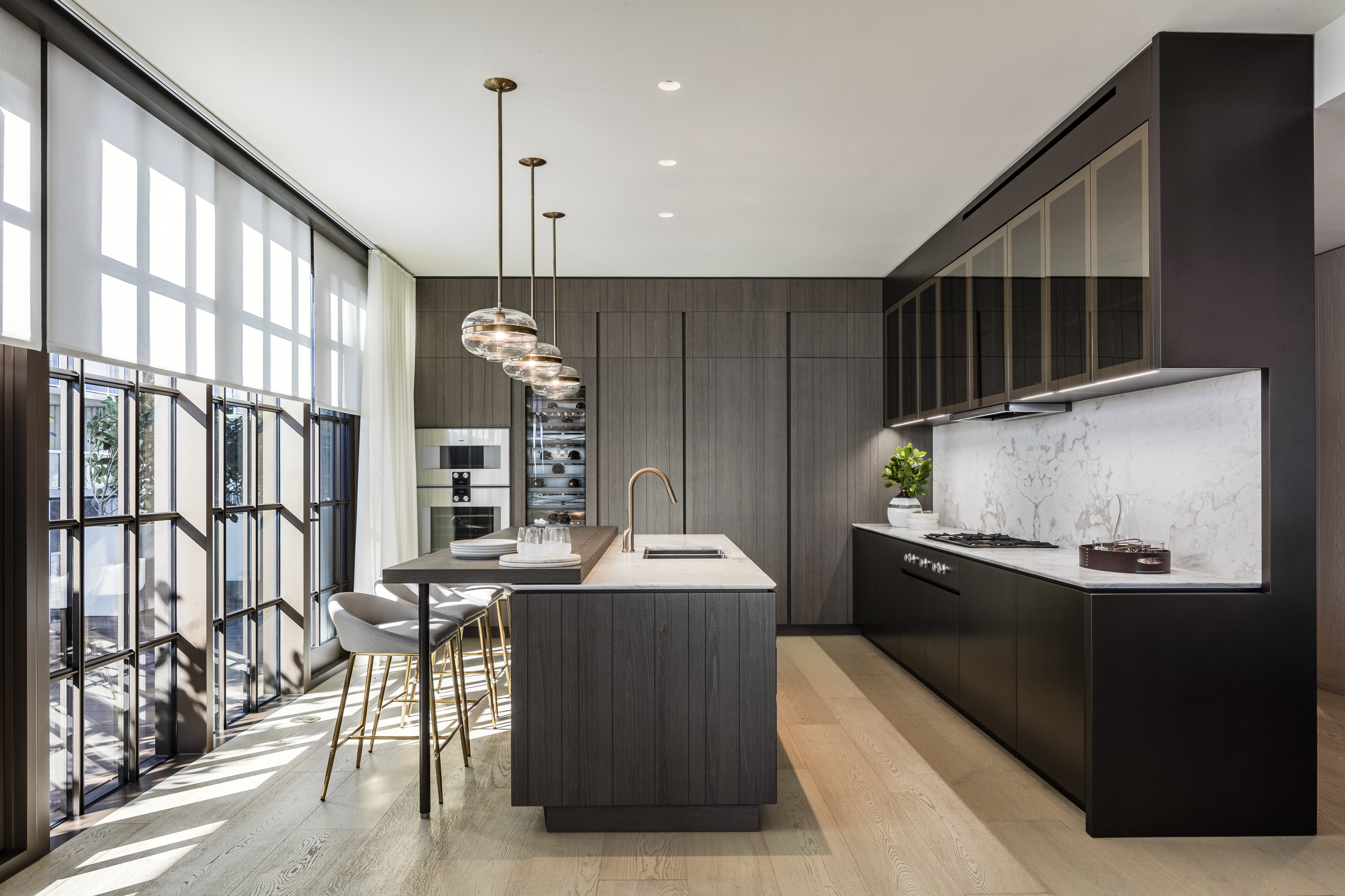 Residence features include direct elevator entry with fingerprint recognition technology, floor to ceiling bronze Schuco gridded insulated and laminated glass wall system. Wraparound terraces with Roman travertine ceilings and Brazilian Ipe decks, and expansive living, dining and entertaining area with Roman travertine accent wall and linear cove lighting. Flooring is luxurious 11” wide 10-foot long Italian White Oak with brushed pearl finish.